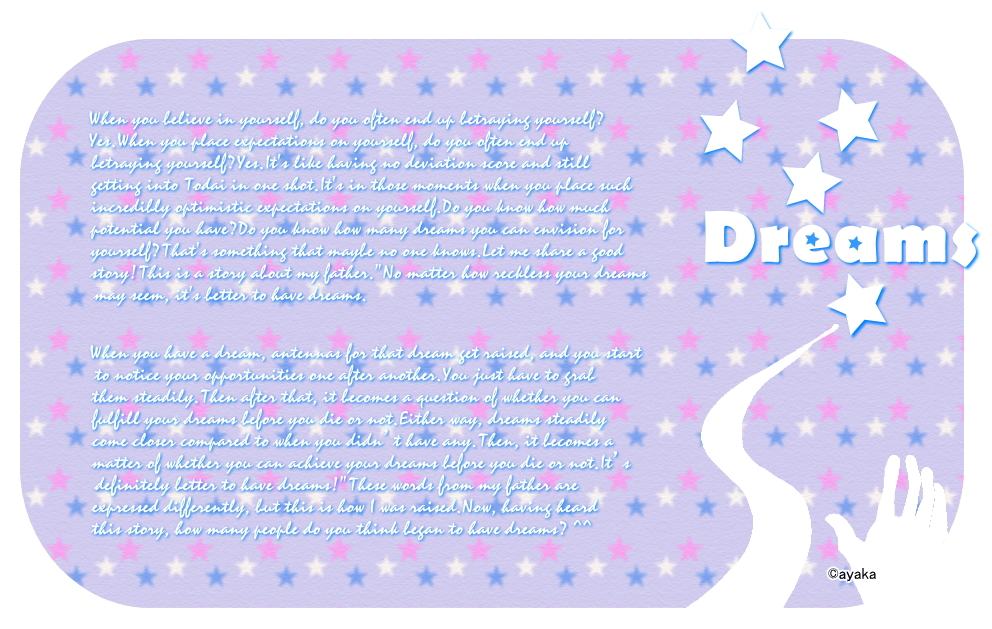 When you believe in yourself, do you often end up betraying yourself?Yes.When you place expectations on yourself, do you often end up betraying yourself?Yes.It's like having no deviation score and still getting into Todai in one shot.It's in those moments when you place such incredibly optimistic expectations on yourself.Do you know how much potential you have?Do you know how many dreams you can envision for yourself?That's something that maybe no one knows.Let me share a good story!This is a story about my father."No matter how reckless your dreams may seem, it's better to have dreams.When you have a dream, antennas for that dream get raised, and you start to notice your opportunities one after another.You just have to grab them steadily.Then after that, it becomes a question of whether you can fulfill your dreams before you die or not.Either way, dreams steadily come closer compared to when you didn’t have any.Then, it becomes a matter of whether you can achieve your dreams before you die or not.It’s definitely better to have dreams!"These words from my father are expressed differently, but this is how I was raised.Now, having heard this story, how many people do you think began to have dreams? ^^