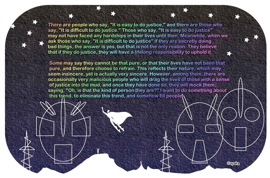 There are people who say, "It is easy to do justice," and there are those who say, "It is difficult to do justice." Those who say, "It is easy to do justice" may not have faced any hardships in their lives until then. Meanwhile, when we ask those who say, "It is difficult to do justice" if they are secretly doing bad things, the answer is yes, but that is not the only reason. They believe that if they do justice, they will have a lifelong responsibility to uphold it. Some may say they cannot be that pure, or that their lives have not been that pure, and therefore choose to refrain. This reflects their nature, which may seem insincere, yet is actually very sincere. However, among them, there are occasionally very malicious people who will drag the lives of those with a sense of justice into the mud, and once they have done so, they will mock them, saying, "Oh, is that the kind of person they are?" I want to do something about this trend, to eliminate this trend, and somehow fill people's hearts with a sense of justice. I want to build a world where the stains of life do not become a burden in walking a life of justice. P.S. The strongest heroes in such matters are satirical comedians. They are truly resilient in doing justice, and even when their own non-pure points and stains are exposed, they simply laugh it off and make jokes. We should learn from their attitude.