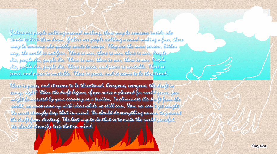 If there are people walking around smiling, there may be someone inside who wants to kick them down. If there are people walking around making a fuss, there may be someone who quietly wants to escape. They are the same person. Either way, the world is not fair. There is war, there is war, there is war. People die, people die, people die. There is war, there is war, there is war. People die, people die, people die. There is peace, and peace is unstable. There is peace, and peace is unstable. There is peace, and it seems to be threatened. There is peace, and it seems to be threatened. Everyone, everyone, the draft is scary, right? When the draft begins, if you raise a placard for world peace, you might be arrested by your country as a traitor. To eliminate the draft from the world, we must come up with ideas while we still can. Now, we won't get caught. We must strongly keep that in mind. We should do everything we can to prevent the draft from starting. The best way to do that is to make the world peaceful. We should strongly keep that in mind.