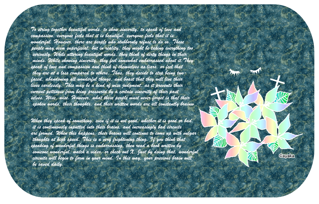 To string together beautiful words, to show sincerity, to speak of love and compassion, everyone feels that it is beautiful, everyone feels that it is wonderful. However, there are people who stubbornly refuse to do so. These people may seem superficial, but in reality, they might be taking everything too seriously. While uttering beautiful words, they think of dirty things in their minds. While showing sincerity, they feel somewhat embarrassed about it. They speak of love and compassion and think of themselves as liars, or feel that they are at a loss compared to others. Thus, they decide to stop being two-faced, abandoning all wonderful things, and boast that they will live their lives carelessly. This may be a kind of wise judgment, as it prevents their current pettiness from being pressured by a certain sincerity of their past selves. Wise, wise. However, what these people must never forget is that their spoken words, their thoughts, and their written words are all constantly brainwashing their own minds. When they speak of something, even if it is not good, whether it is good or bad, it is continuously inputted into their brains, and increasingly bad circuits are formed. When this happens, their brains will continue to come up with vulgar thoughts at high speed. This is a very frightening thing. If you think that speaking of wonderful things is embarrassing, then read a book written by someone wonderful, watch a video, or check out X. Just by doing that, wonderful circuits will begin to form in your mind. In this way, your precious brain will be saved daily.