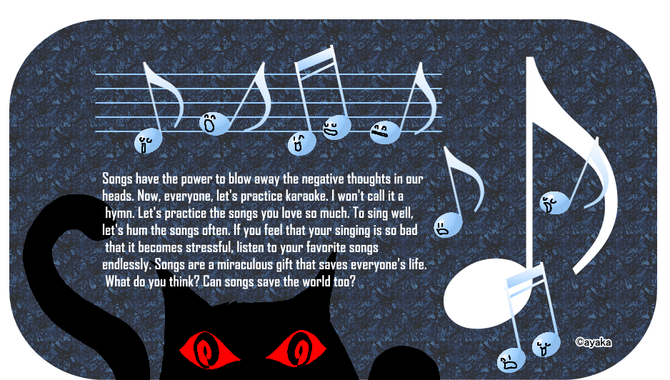 Songs have the power to blow away the negative thoughts in our heads. Now, everyone, let's practice karaoke. I won't call it a hymn. Let's practice the songs you love so much. To sing well, let's hum the songs often. If you feel that your singing is so bad that it becomes stressful, listen to your favorite songs endlessly. Songs are a miraculous gift that saves everyone's life. What do you think? Can songs save the world too?