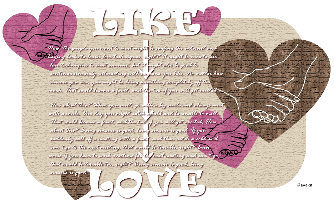 Now, the people you want to meet might be surfing the internet and buying books to learn love techniques, right? It might be nice to use love techniques to meet someone, but it might also be good to continue sincerely interacting with someone you like. No matter how sincere you are, you might be doing something completely off the mark. That could become a feint, and the two of you will get excited. How about this? When you meet, go with a big smile and always meet with a smile. One day you might catch a cold and be unable to meet. That could become a feint, and the two of you will get excited. How about this? Being sincere is good, being sincere is good. If you suddenly call off a meeting with a feint, and then catch a cold and can't go to the next meeting, that would be terrible, right? Even worse if you have to work overtime for the next meeting and can't go, that would be terrible too, right? Being sincere is good, being sincere is good.