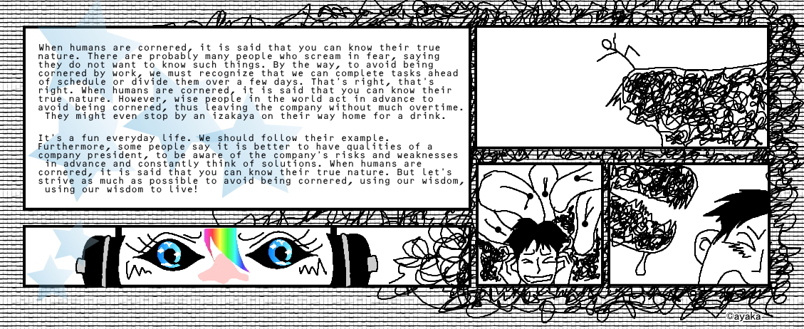 When humans are cornered, it is said that you can know their true nature. There are probably many people who scream in fear, saying they do not want to know such things. By the way, to avoid being cornered by work, we must recognize that we can complete tasks ahead of schedule or divide them over a few days. That's right, that's right. When humans are cornered, it is said that you can know their true nature. However, wise people in the world act in advance to avoid being cornered, thus leaving the company without much overtime. They might even stop by an izakaya on their way home for a drink. It's a fun everyday life. We should follow their example. Furthermore, some people say it is better to have qualities of a company president, to be aware of the company's risks and weaknesses in advance and constantly think of solutions. When humans are cornered, it is said that you can know their true nature. But let's strive as much as possible to avoid being cornered, using our wisdom, using our wisdom to live!