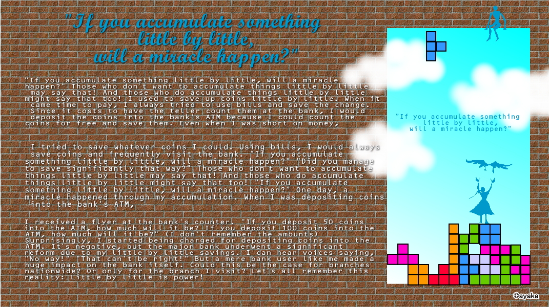"If you accumulate something little by little, will a miracle happen?" Those who don’t want to accumulate things little by little may say that! And those who do accumulate things little by little might say that too! I used to save up coins little by little. When it came time to pay, I always tried to use bills and save the change. Since it costs to have the teller count them at the bank, I would deposit the coins into the bank's ATM because I could count the coins for free and save them. Even when I was short on money, I tried to save whatever coins I could. Using bills, I would always save coins and frequently visit the bank. "If you accumulate something little by little, will a miracle happen?" "Did you manage to save significantly that way?" Those who don’t want to accumulate things little by little may say that! And those who do accumulate things little by little might say that too! "If you accumulate something little by little, will a miracle happen?" One day, a miracle happened through my accumulation. When I was depositing coins into the bank's ATM, I received a flyer at the bank's counter. "If you deposit 50 coins into the ATM, how much will it be? If you deposit 100 coins into the ATM, how much will it be?" (I don't remember the amounts) Surprisingly, I started being charged for depositing coins into the ATM. It’s negative, but the major bank underwent a significant reform due to my little by little savings. I can hear voices saying, "No way!" "That can't be right!" But a mere bank user like me made a huge impact on the bank itself. Could this be the case for branches nationwide? Or only for the branch I visit? Let’s all remember this reality: Little by little is power!