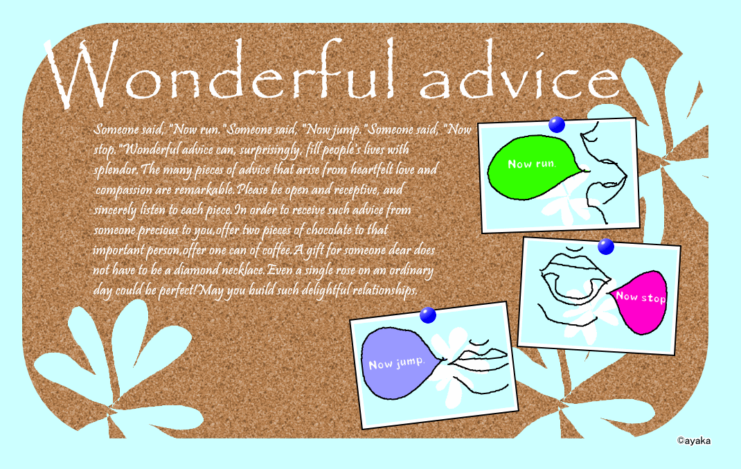Someone said, "Now run."Someone said, "Now jump."Someone said, "Now stop."Wonderful advice can, surprisingly, fill people's lives with splendor.The many pieces of advice that arise from heartfelt love and compassion are remarkable.Please be open and receptive, and sincerely listen to each piece.In order to receive such advice from someone precious to you,offer two pieces of chocolate to that important person,offer one can of coffee.A gift for someone dear does not have to be a diamond necklace.Even a single rose on an ordinary day could be perfect!May you build such delightful relationships.