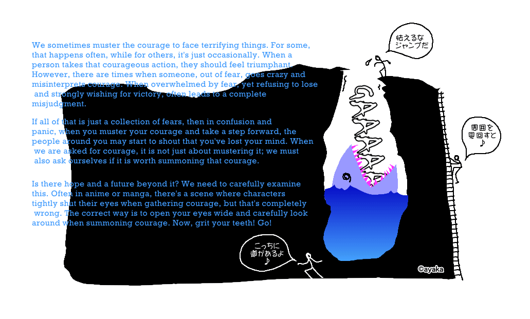 We sometimes muster the courage to face terrifying things. For some, that happens often, while for others, it's just occasionally. When a person takes that courageous action, they should feel triumphant. However, there are times when someone, out of fear, goes crazy and misinterprets courage. When overwhelmed by fear, yet refusing to lose and strongly wishing for victory, often leads to a complete misjudgment. If all of that is just a collection of fears, then in confusion and panic, when you muster your courage and take a step forward, the people around you may start to shout that you've lost your mind. When we are asked for courage, it is not just about mustering it; we must also ask ourselves if it is worth summoning that courage. Is there hope and a future beyond it? We need to carefully examine this. Often in anime or manga, there's a scene where characters tightly shut their eyes when gathering courage, but that's completely wrong. The correct way is to open your eyes wide and carefully look around when summoning courage. Now, grit your teeth! Go!