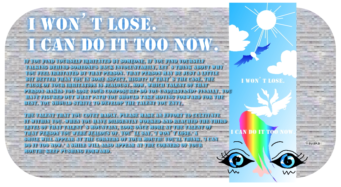 If you find yourself irritated by someone, If you find yourself talking behind someone's back involuntarily, Let’s think about why you feel irritated by that person. That person may be just a little bit better than you in some aspect, right? If that’s the case, the cause of your irritation is jealousy. Now, which talent of that person makes you lose your composure? Do you understand? Finally, you have figured out what path you should take moving forward for the best. You should strive to develop the talent you envy, The talent that you covet badly. Please make an effort to cultivate it within you. When you have diligently worked and reached the third level of that talent’s mountain, Look once more at the talent of that person you were jealous of. You’ll say, 'I won’t lose.' A smile will appear at the corners of your mouth! You'll think, 'I can do it too now.' A smile will also appear at the corners of your mouth! Keep pushing forward.