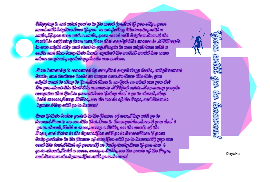 Skipping is not what you're in the mood for,But if you skip, your mood will brighten.Even if you’re not feeling like turning with a smile,If you turn with a smile, your mood will brighten.Even if the world is suffering from war,Does that apply?The answer is NO!People in war might skip and start to cry.People in war might turn with a smile and then bang their heads against the wall.A world has come where magical psychology books are useless.Now humanity is consumed by war,And psychology books, enlightenment books, and business books no longer save.In times like this, you might want to cling to God,But there is no God, so what can you do?Do you shout like that?The answer is NO!God exists.Now many people recognize that God is present.Even if they don’t go to church, they hold crosses,Carry Bibles, see the words of the Pope, and listen to hymns.They will go to heaven!Even if their bodies perish in the flames of war,They will go to heaven!Now is an era like that.Now is Armageddon.Even if you don’t go to church,Hold a cross, carry a Bible, see the words of the Pope, and listen to the hymns.You will go to heaven!Even if your body perishes in the flames of war,You will go to heaven!If you can read this text,Think of yourself as truly lucky.Even if you don’t go to church,Hold a cross, carry a Bible, see the words of the Pope, and listen to the hymns.You will go to heaven!