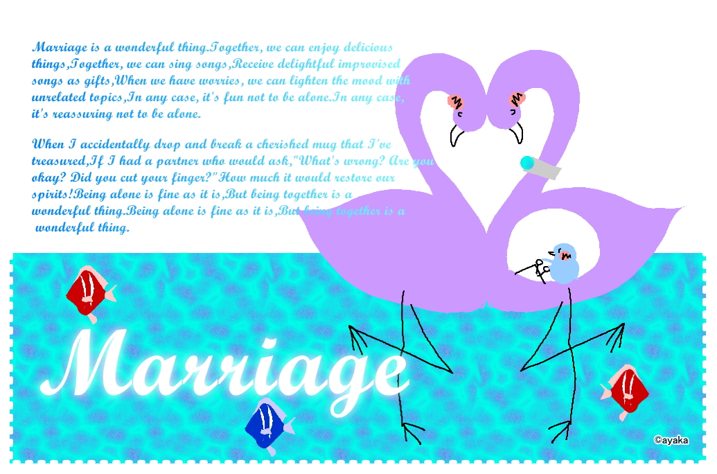 Marriage is a wonderful thing.Together, we can enjoy delicious things,Together, we can sing songs,Receive delightful improvised songs as gifts,When we have worries, we can lighten the mood with unrelated topics,In any case, it's fun not to be alone.In any case, it's reassuring not to be alone.When I accidentally drop and break a cherished mug that I've treasured,If I had a partner who would ask,"What's wrong? Are you okay? Did you cut your finger?"How much it would restore our spirits!Being alone is fine as it is,But being together is a wonderful thing.Being alone is fine as it is,But being together is a wonderful thing.