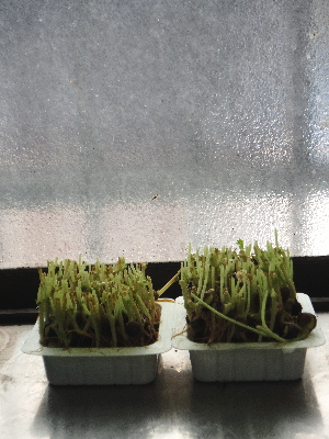 豆苗を2つにカットしてお豆腐のケースに入れ栽培。