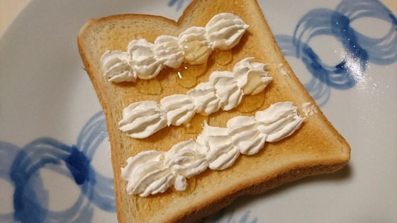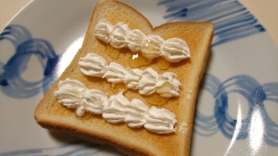 トーストした食パンに生クリームを絞ってハチミツをかけて出来上がり。