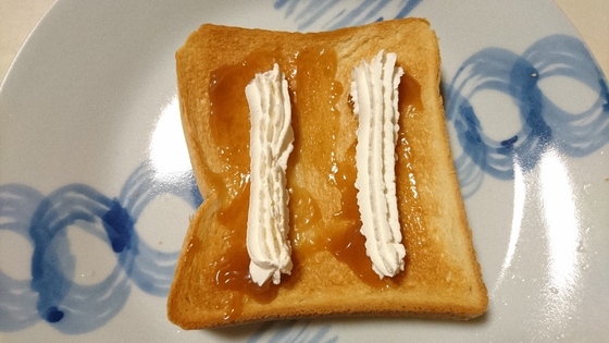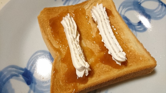 トーストした食パンにピーナッツバターを塗り生クリームを飾ってください。