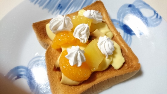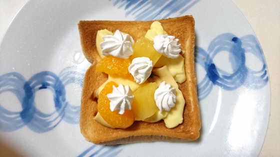 ※果物はフルーツ缶を使えばいいでしょう。朝からケーキを食べてる風を味わえるお手軽トーストです。生クリームは市販のホイップされているものを使ってください。