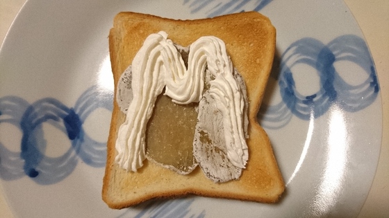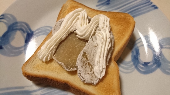 トーストした食パンに干しいもを並べ上から生クリームを飾って出来上がり。