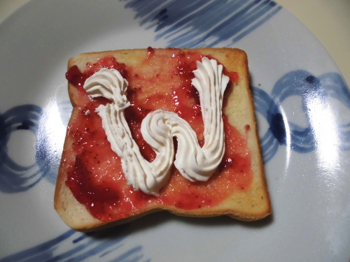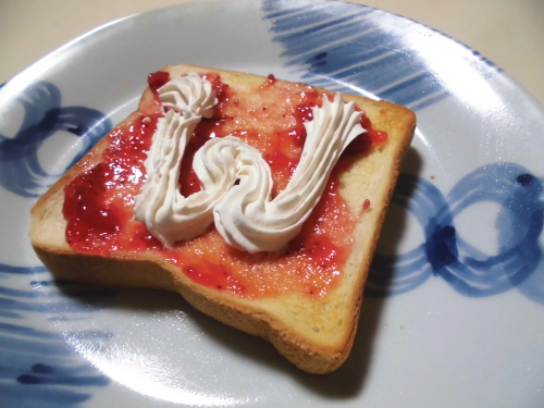 トーストした食パンに、イチゴジャムを塗り、ホイップ生クリームを飾るだけ。