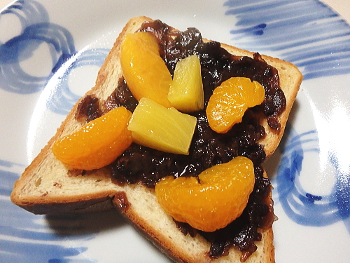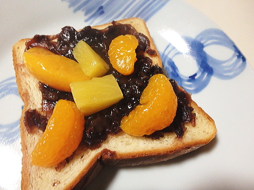 トーストした食パンに、あんこを塗り、上にフルーツを飾ってください。
