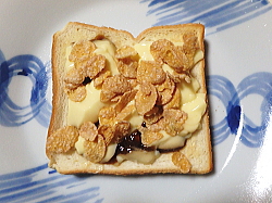 ※コーンフレークでなんだかんだ栄養バランスがよくなったトーストです。プリンのプルプルとフレークのざくざくがよくあう。