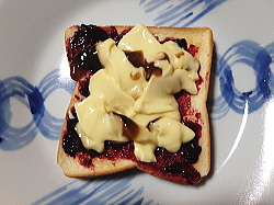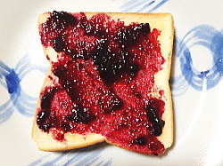 トーストした食パンにブルーベリージャムを塗ったら、上からプリンを盛り付けてください。