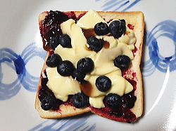 ※プリンの甘さとブルーベリーの甘酸っぱさが癖になりそう。やみつきトーストの出来上がり。