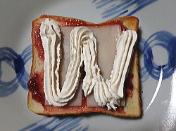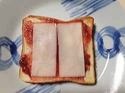 食パンにイチゴジャムを塗り、しゃぶしゃぶもちを乗せてください。