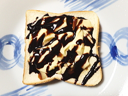 トーストした食パンにプリンを盛り付けたら、上からチョコレートソースをたっぷりとかけて出来上がり。