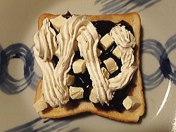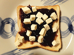 トーストした食パンに、コーヒーゼリーを乗せたら、上からクリームチーズを散らしてください。