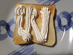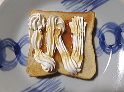 トーストにホイップクリームを絞ったら、上からメープルシロップをたらしてください。
