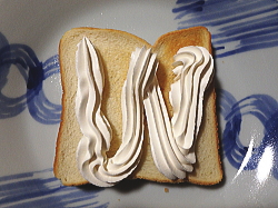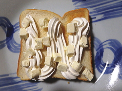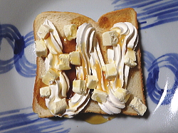 トーストした食パンにホイップクリームを絞ったら、上からメープルシロップをかけてください。