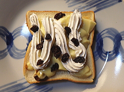 ※レーズンとプリンのベストマッチよ。ホイップクリームが味をさらに増強しております。こいつは何度でも食べたくなるトーストだ。