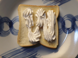 トーストした食パンに、ホイップクリームをたっぷり絞ってください。