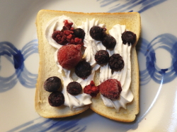 ※冷凍ミックスがシャリシャリとシャーベット状でなかなか、うまし! こいつは夏にイケるトーストなり。