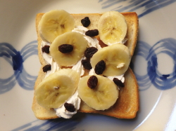 その上にスライスしたバナナを並べたら、レーズンをトッピングしてください。