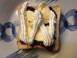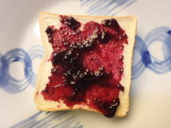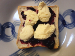 トーストした食パンに、ブルーベリージャムを塗り付けて、アイスクリームを盛り付けてください。