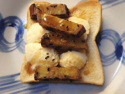 ※残っていた大学いもを見たら、無性にトーストを作りたくなり、作りました。アイスとの相性は抜群。垂らしたメープルもいい仕事してます。