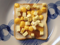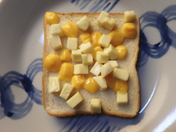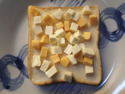 食パンに3種のチーズをトッピングしたら、5分程トーストしてチーズをとろけさせてください。
