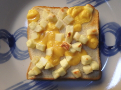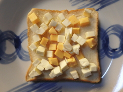 食パンに3種のチーズをトッピングしたら、5分程トーストしてください。
