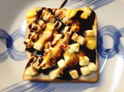 チーズがとろけたら、その上からチョコレートソースをたっぷりとかけて出来上がり。