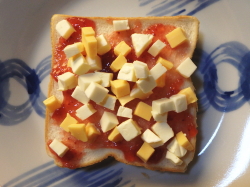 食パンに3種のチーズをトッピングしたら、5分程トーストしてください。