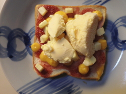 ※3種のチーズトーストを作ったら、やってみたかったこと、アイスON。ここに甘じょっぱと冷え冷えアツアツのコラボ完成なり!冷え冷えアツアツ、2つのアシンメトリーが美味しさの可能性を無限大にした。
