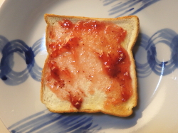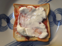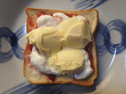トーストした食パンに、いちごジャムを塗ったら、さらにその上からヨーグルトを塗ります。