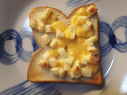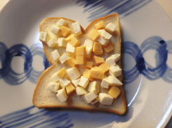 食パンに、ダイス状のチーズをトッピングして、5分程トーストしてください。