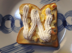 とろけたチーズトーストの上からホイップクリームを絞ったら、上からチョコレートソースをかけて出来上がり。
