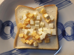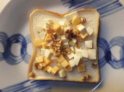 食パンに3種のダイスチーズを盛り付けたら、上からくるみをトッピングしてください。