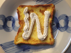 - 焼きあがったフレンチトーストをお皿に盛り、ホイップクリームを絞ったら、上からスライスしたバナナを並べてください。