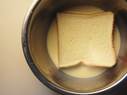 - 1の液に食パンを浸し、表裏で5分程漬け込んでください。