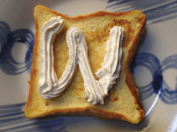 - 焼きあがったフレンチトーストを器に盛り付けたら、上にホイップクリームを絞ってください。