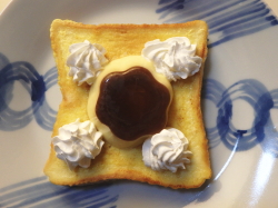 焼きあがったフレンチトーストをお皿に盛り、中央にプリンをプッチンしてください。