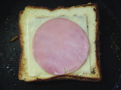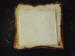 - フレンチトーストの上にとろけるスライスチーズを乗せ、蓋をして、チーズがとろけるのを待ちます。