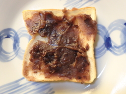 トーストした食パンにあんこをたっぷりと塗ってください。
