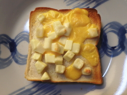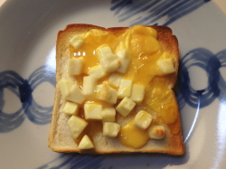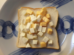 食パンに3種のチーズをトッピングしたら、5分程トーストしてください。